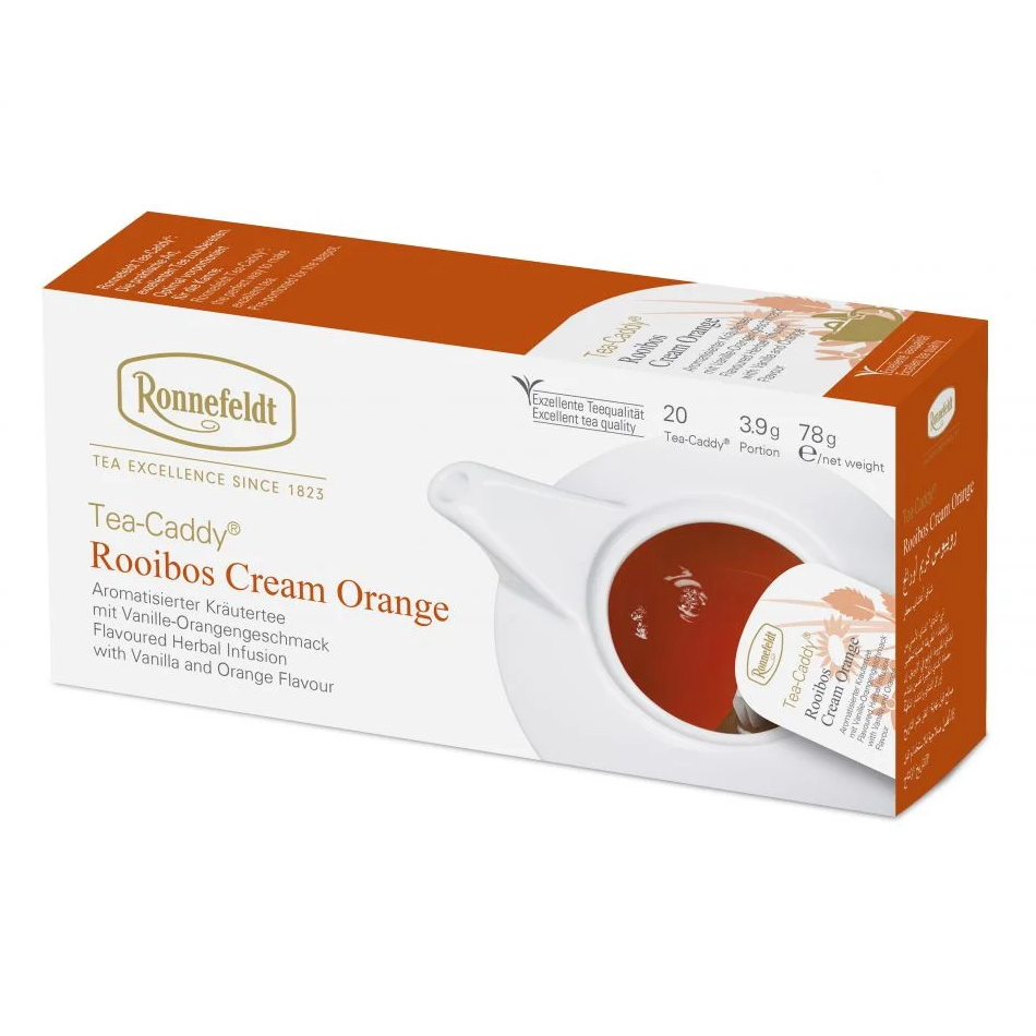 Ronnefeldt Rooibos Cream Orange — экзотический ароматизированный травяной чай, содержащий натуральную цедру апельсина и измельченную ваниль. Состав: ройбош, ароматизатор, цедра апельсина, ваниль.