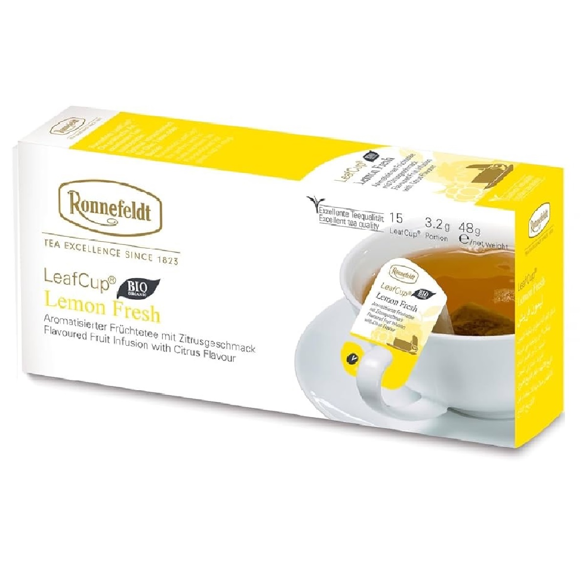 Ronnefeldt Lemon Fresh - этот удивительный фруктовый чай соблазняющий освежающим цитрусовым вкусом. Состав: кусочки яблока, листья сладкой ежевики, жареный корень цикория , натуральный ароматизатор , цедра розы , лемонграсс , цедра лимона.